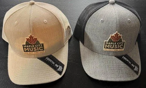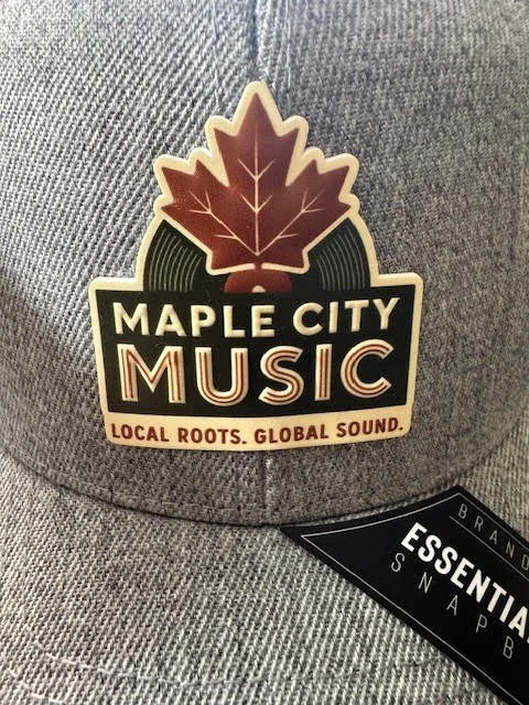 Logo for Maple City Music featuring a maple leaf above a vinyl record, with the text 'Maple City Music' and the tagline 'Local roots. Global sound.'